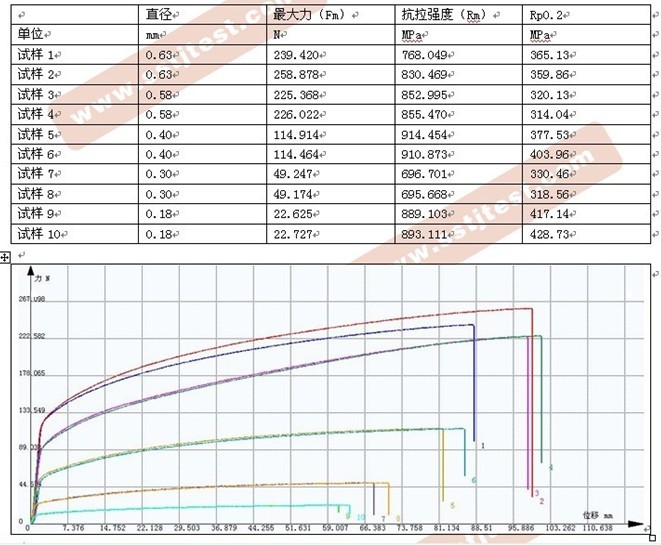 試驗方案:不銹鋼燒結網鋼絲拉伸試驗方案計算標準:GB-T 228-2002試驗設備:CMT1104試樣形狀:線材材料名稱:鋼絲試驗速度:10 mm/min原始標距(Lo):100 mm夾具:鋼絲纏繞濕度:64 %溫度:15 ℃不銹鋼燒結網鋼絲拉伸試驗報告: